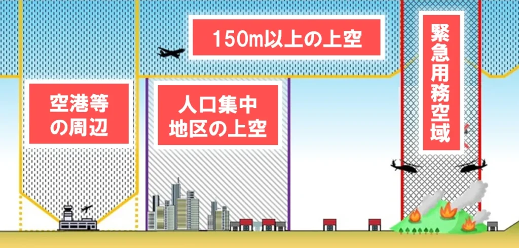 ドローンを飛ばす際は「航空法」という法律が適用されます。航空法では飛行の方法、飛行空域によって規制されている飛行(特定飛行)が設定されています。