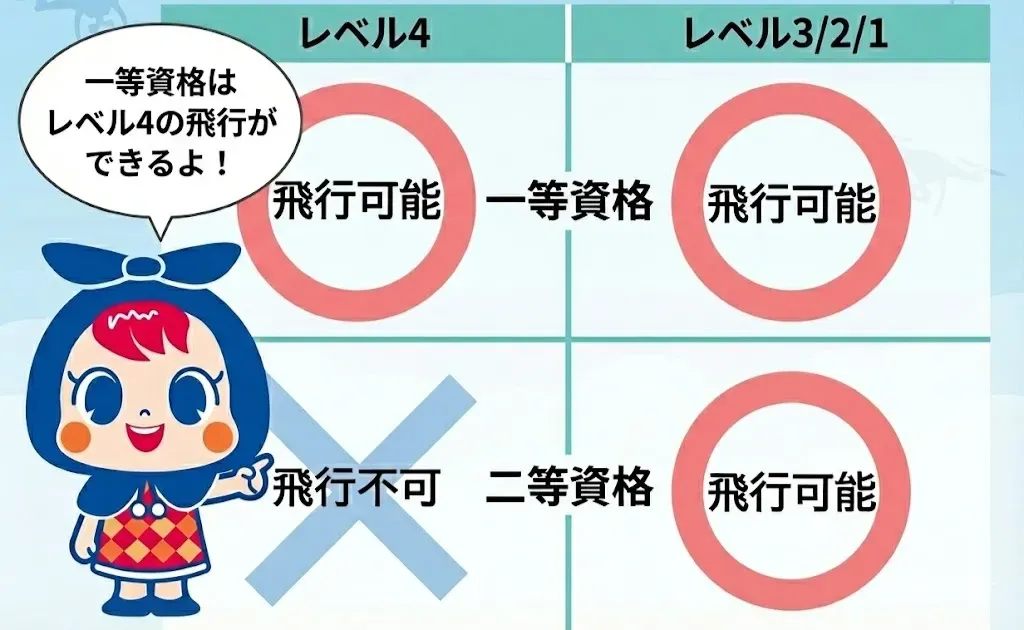 つまり、一等無人航空機操縦士(一等資格)と二等無人航空機操縦士(二等資格)の違いは、