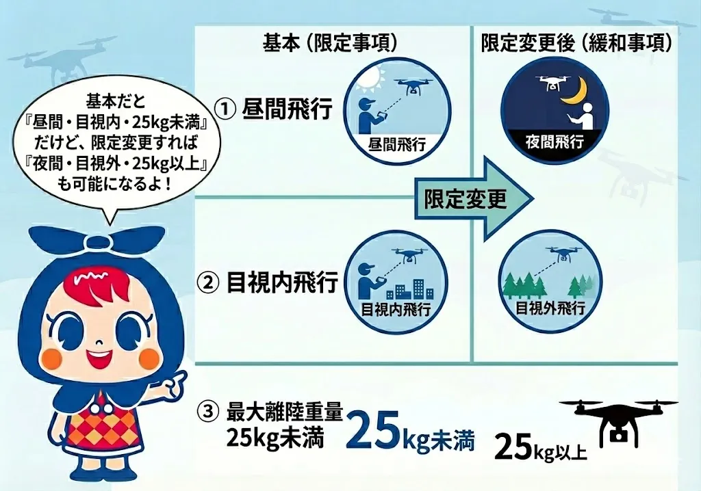 限定変更とは?(夜間・目視外・25kgなど)