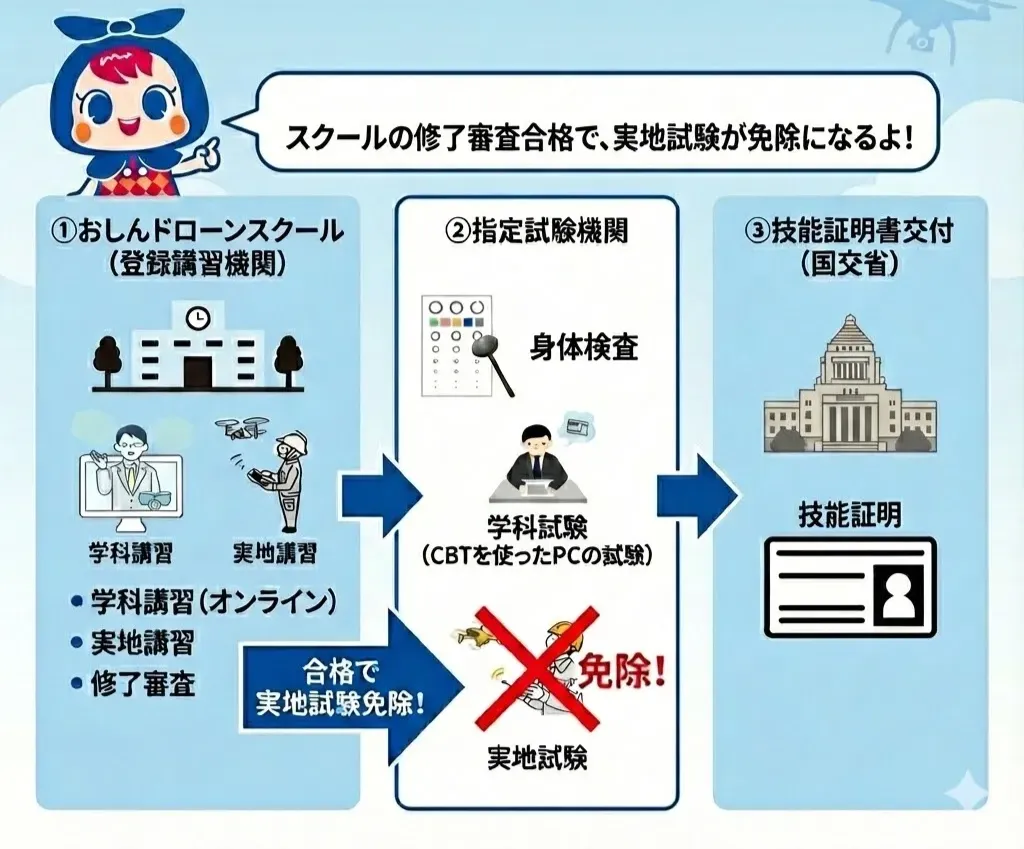 です。この3つの試験に合格してドローン国家資格を取得するには、主に2つの方法があります。