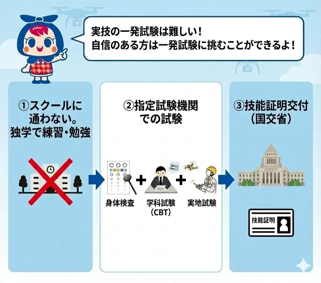自動車運転免許取得の際も、自身がある方は教習所に通わず一発試験を受験することが可能です。ドローン国家資格もスクールに通わず、一発試験に合格して取得する方法もあります。