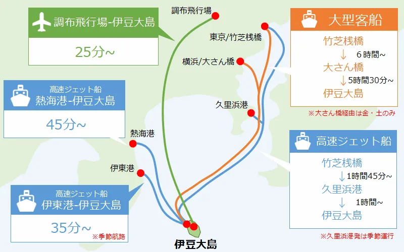 - ジェット船 (東京→大島 1時間45分、熱海→大島 45分)