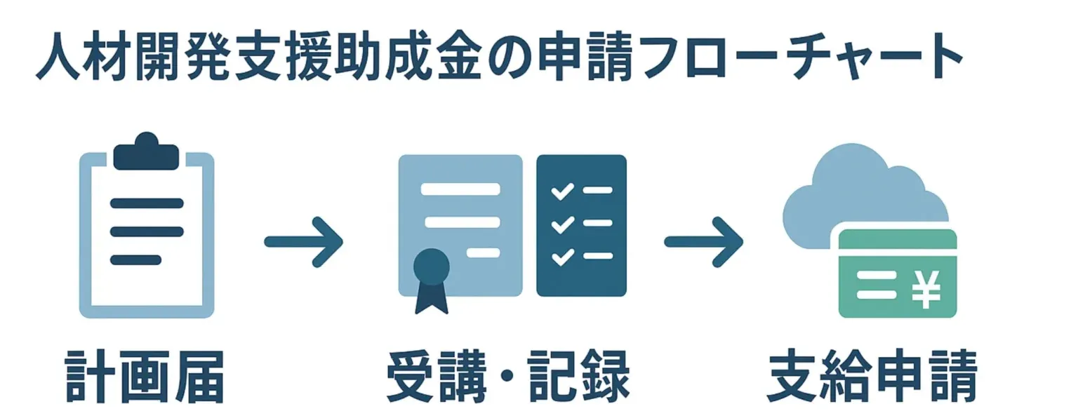 申請主体・訓練概要・助成の種類を正式に申立て。終了翌日〜2か月以内が締切(厳守)。